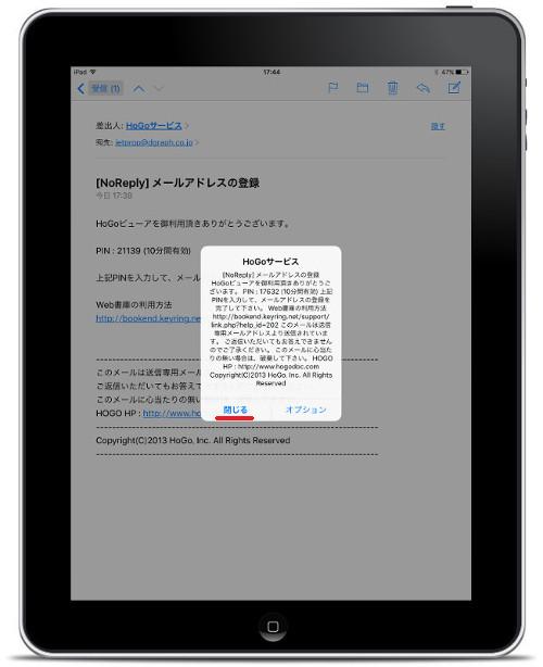 HoGoビューアのインストールに失敗した場合やPINコードの入力が正常に作動しない場合は、メールアドレスの再確認とともに、HoGoビューアを一度削除(アンインストール)して、再度手順通りに再インストールしてください。