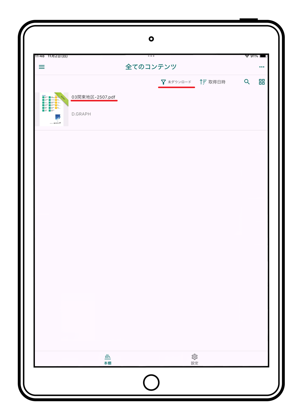2. 本棚から"全てのコンテンツ"の「未ダウンロード」を開いてください。