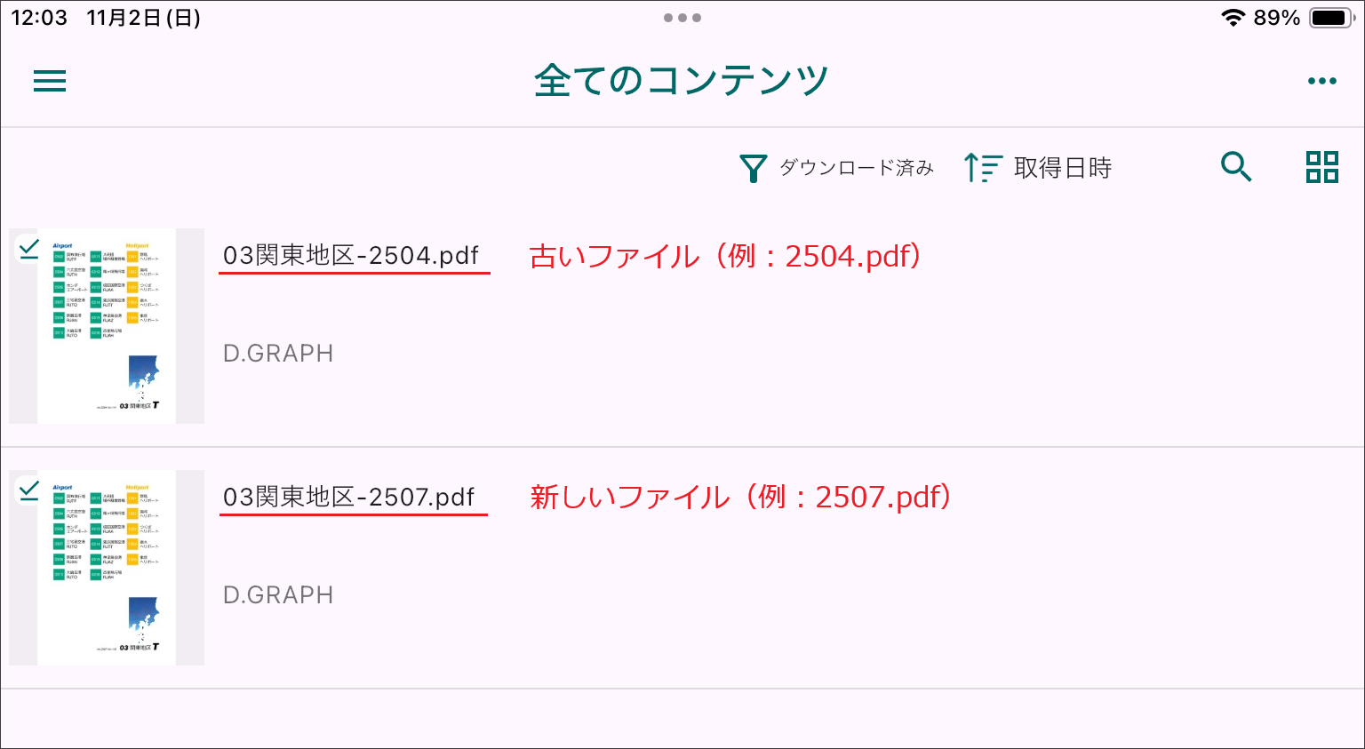 全てのコンテンツの「ダウンロード済み」にはアップデータされた新しいファイルだけが表示されます。