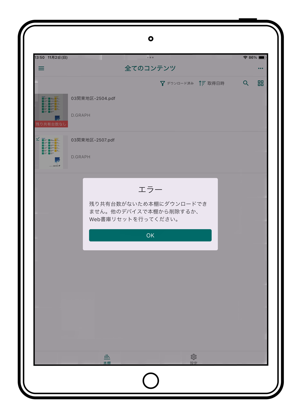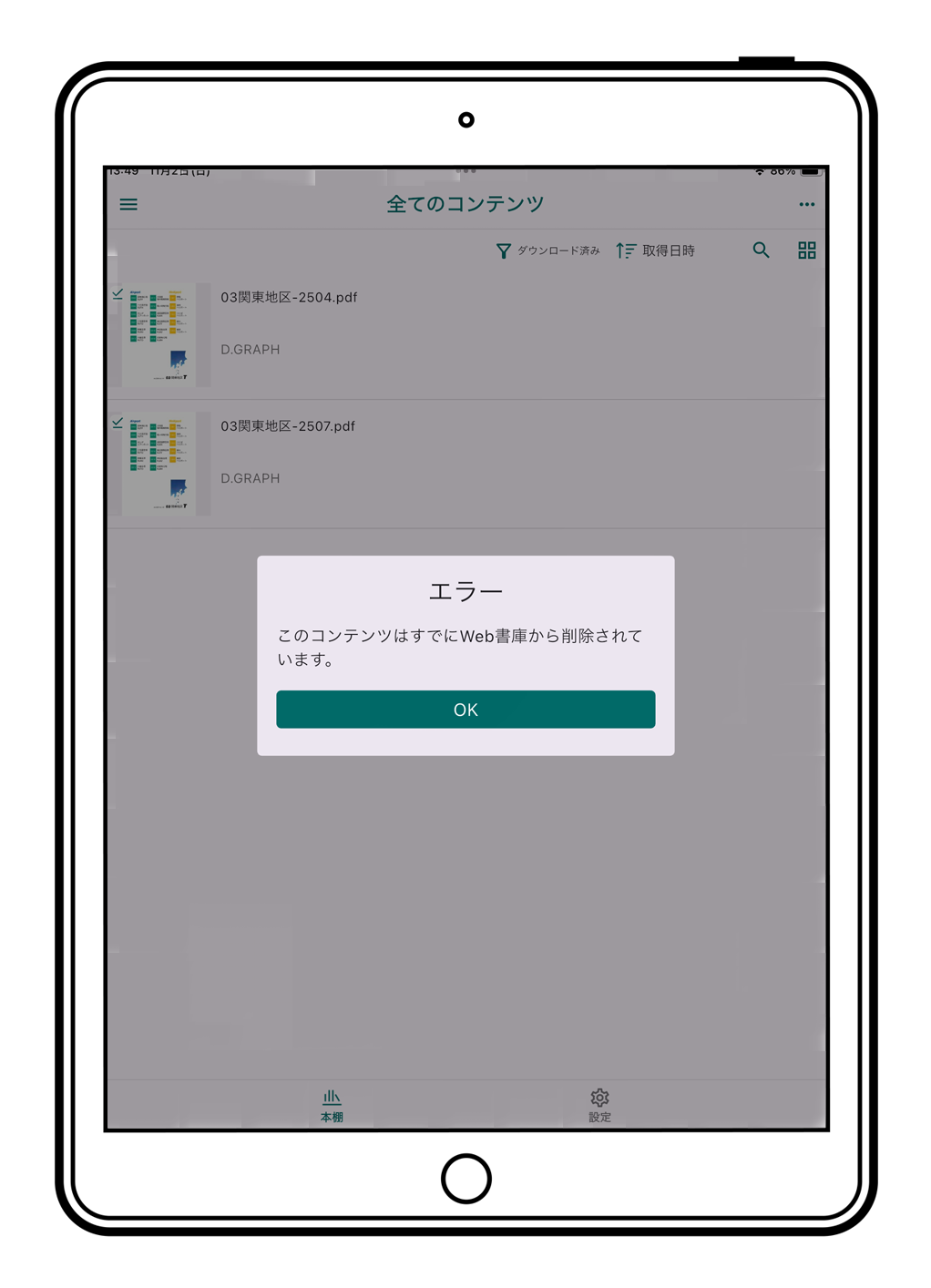 何らかの理由により、新ファイル配信後3日後に自動的にファイルの削除がおこなわれない場合や、手動により本棚で新しいファイルの確認操作をする場合(手動による不要ファイル削除)は、古い不要ファイルのサムネイルをタップしてください。エラー(※このコンテンツはすでにWeb書庫から削除されています)が表示されますので「OK」をタップしてください。