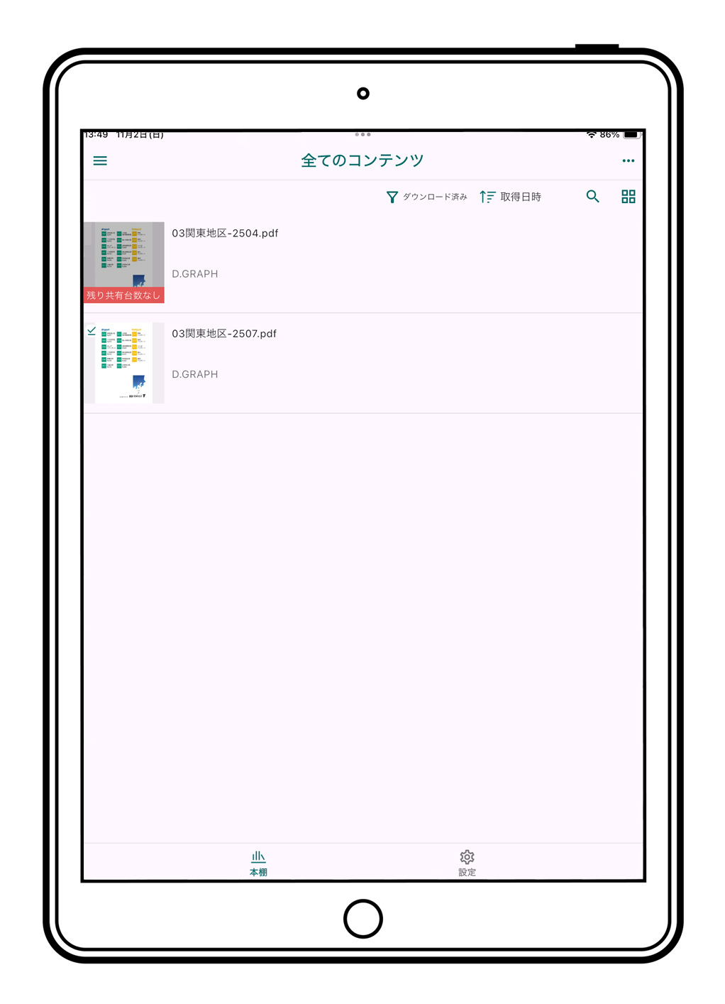 (2)次に、インターネット環境を整えてご利用の端末から専用PDFビューア"HoGo"を起動して、本棚「全てのコンテンツ」画面を開いてください。