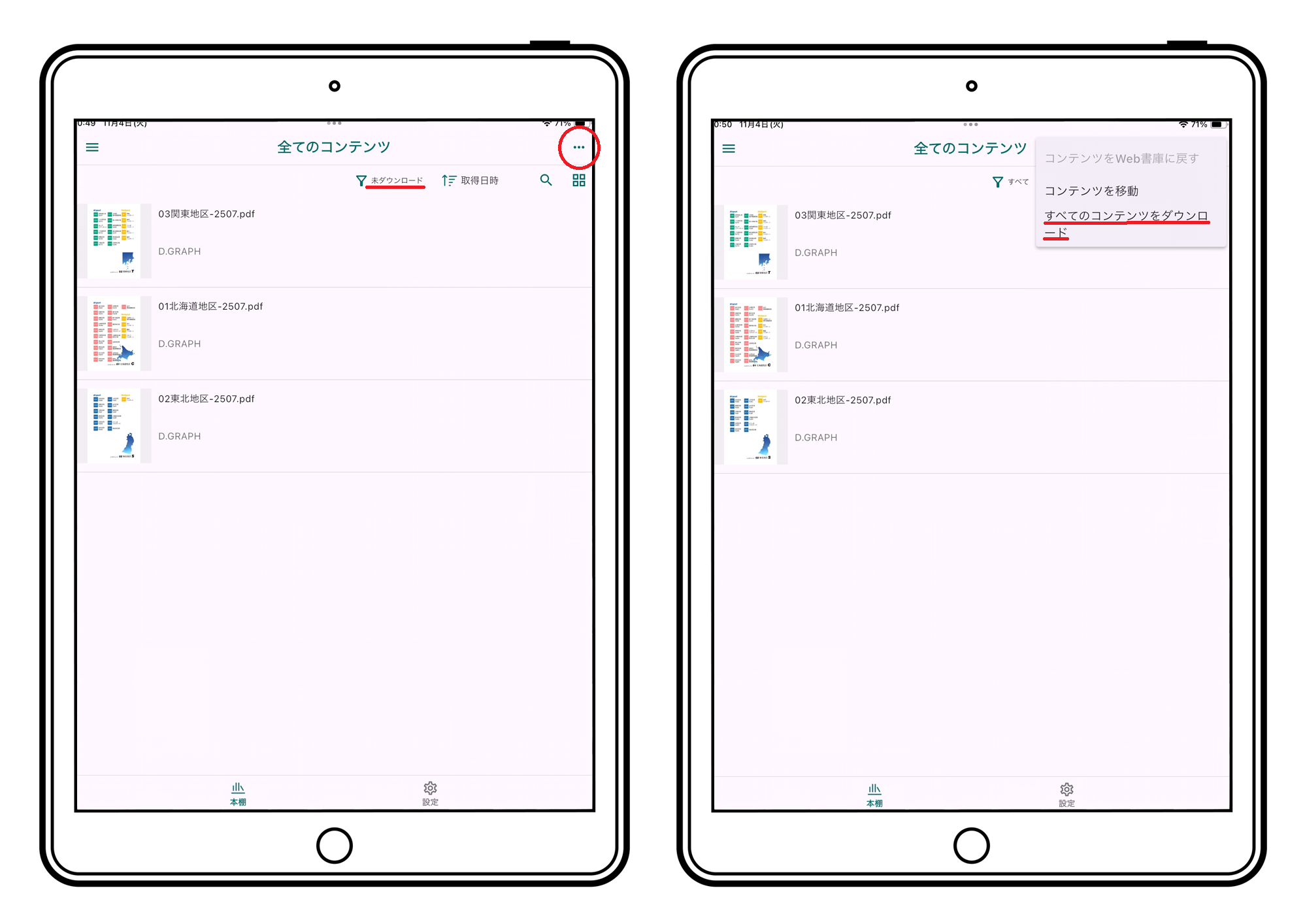 画面右上のメニューボタン【…】を開いて「すべてのコンテンツをダウンロード」を選択してください。