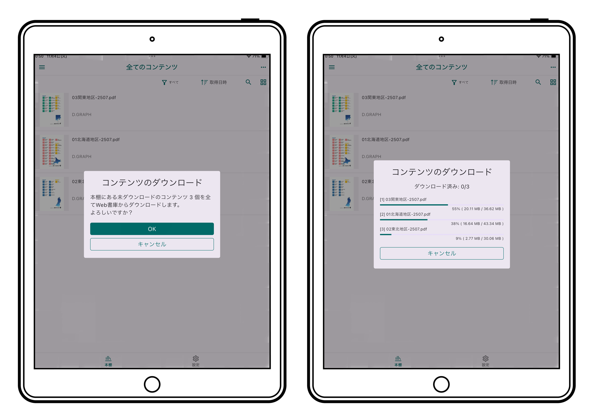 "コンテンツのダウンロード"ダイアログで「OK」ボタンをタップすると各未ダウンロードファイルのダウンロードが開始されます。