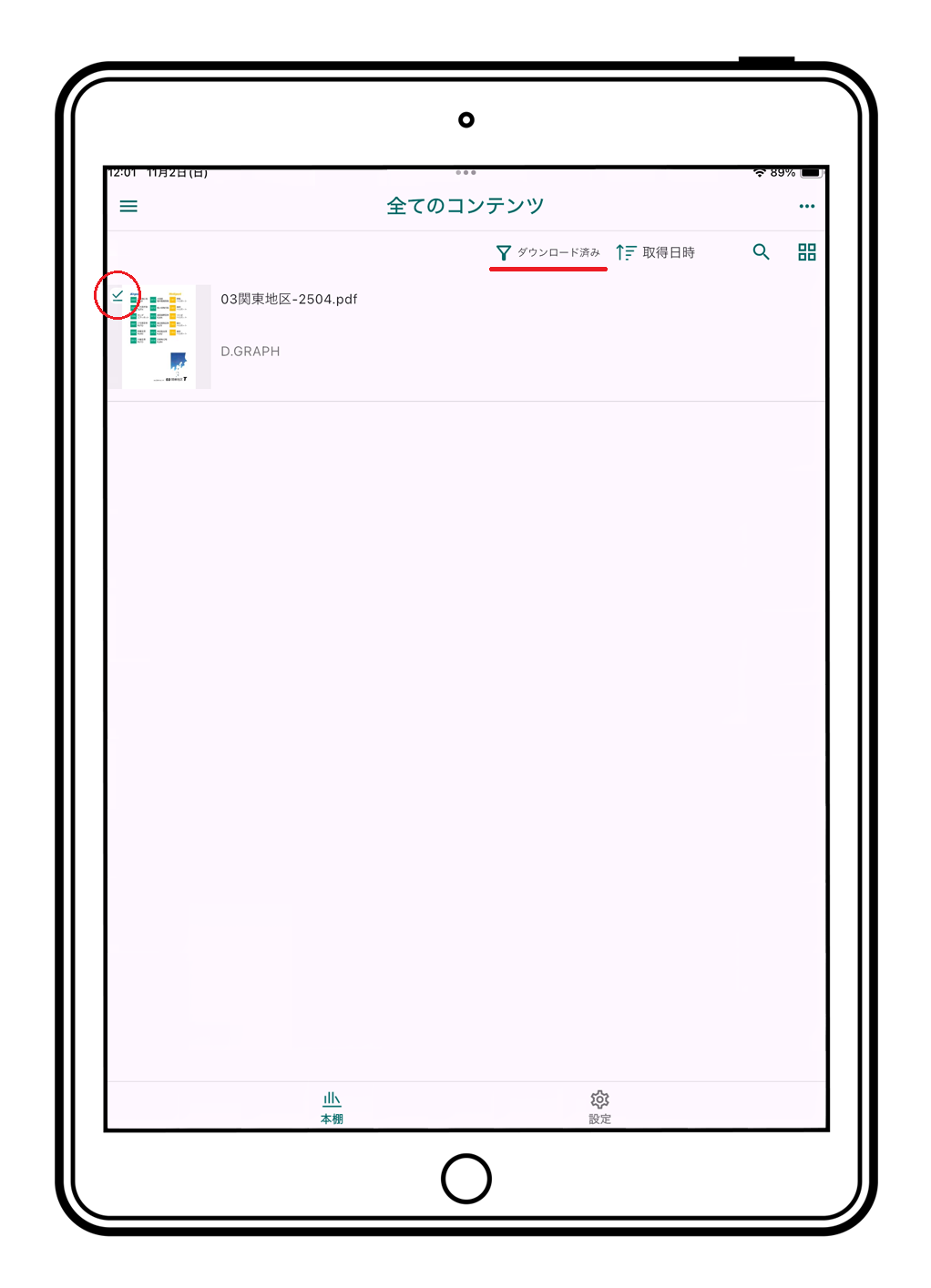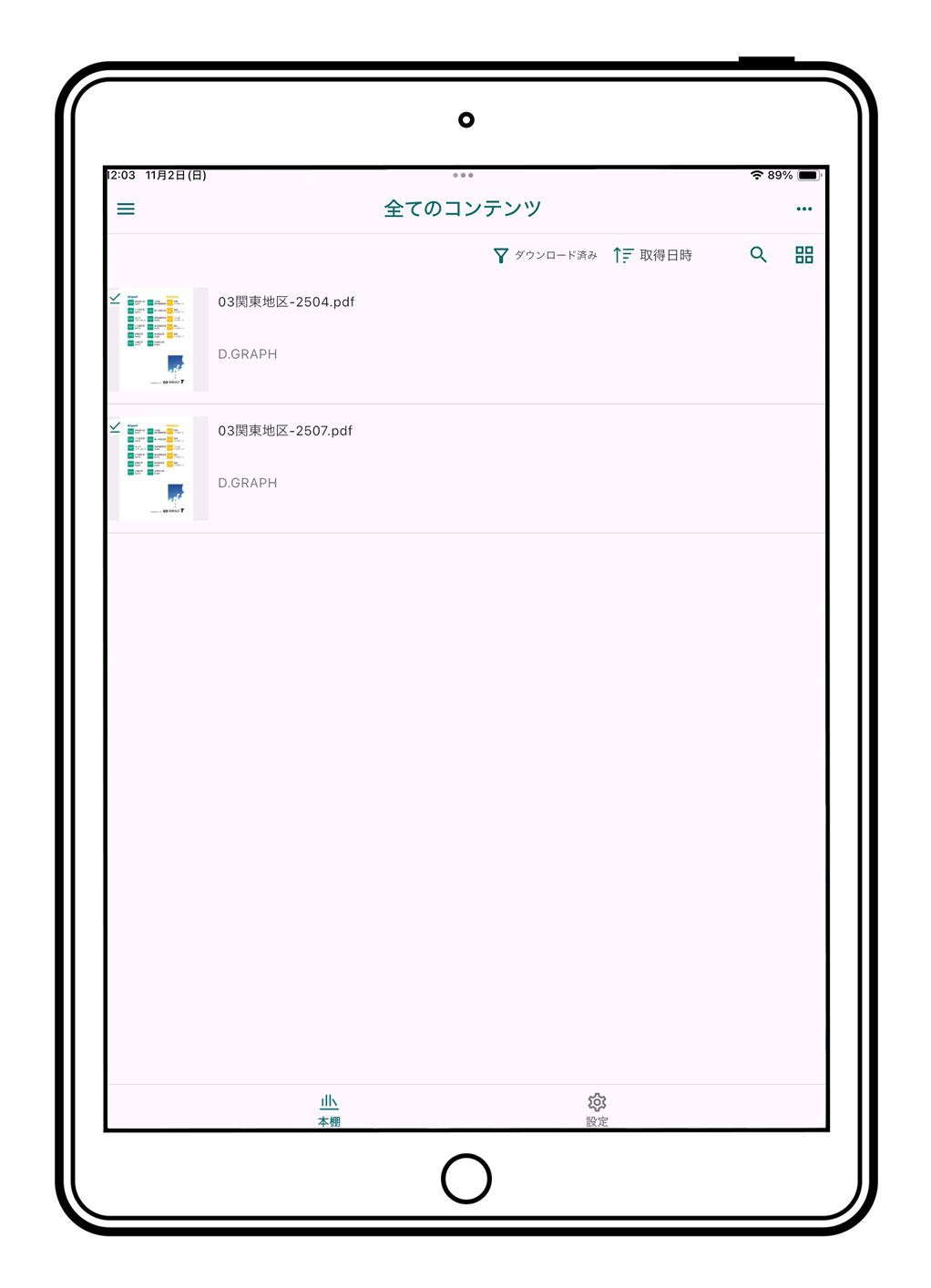 (2)次に、インターネット環境を整えてご利用の端末から専用PDFビューア"HoGo"を起動して、本棚「全てのコンテンツ」画面を開いてください。