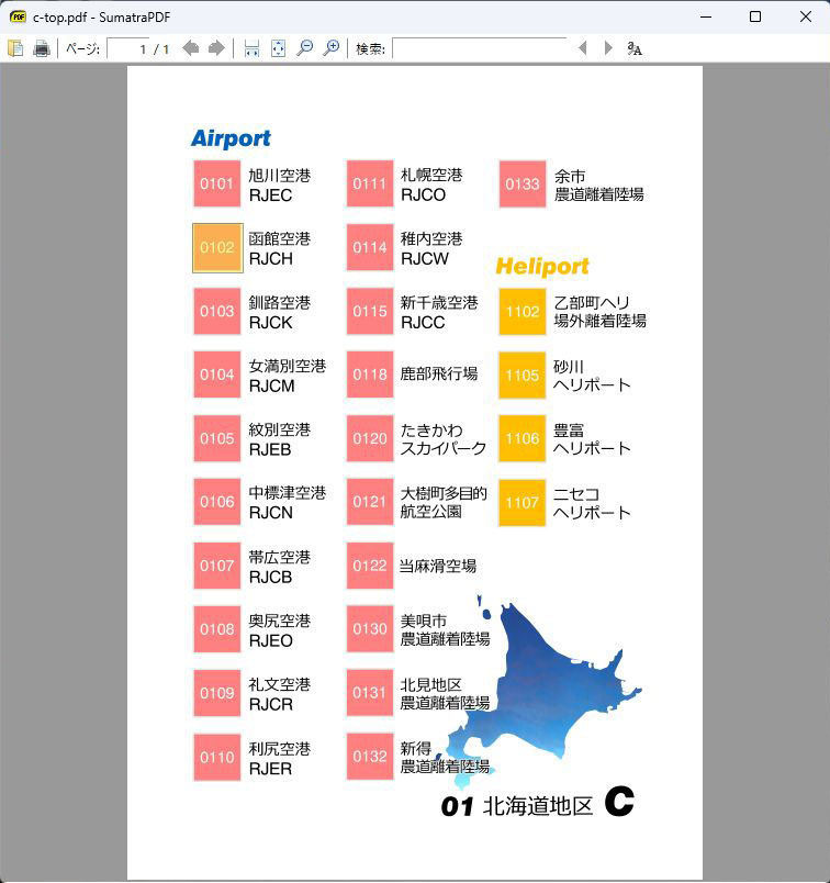 トップページの地区別ボタンから閲覧を希望する"空港の地区名を選択"してください。「地区別インデックス」のページが別ウインドウで開かれます。
