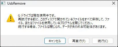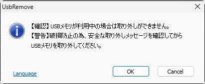 また、USBメモリ内の「Usb安全な取り外し.exe」でも同様に安全な取り外しができます。その場合、安全な取り外しが確認されると「UsbRemove」が表示されます。