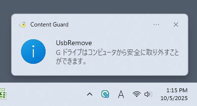 USBが安全に取り外されると「UsbRemove」の通知バナーがタスクバー右下より表示されます。