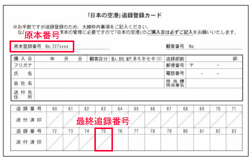 追録送付をご希望の場合にご利用ください。入力項目の原本番号は、お手元の原本の「追録登録カード」上部に7桁の数字で記載されています。また、最終追録の番号は、原本の「改訂版記録表」でご確認いただけます。挿入済みの最終追録番号は、"送付済印"の欄に斜線か販売店の済印が押されています。空欄の場合は、その追録番号が挿入されていないか、まだ発行されていないことを示します。