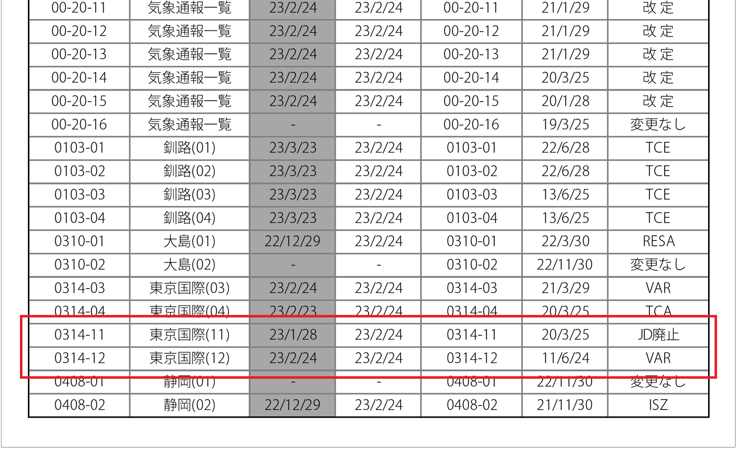 ・下から4行目<0314-11 東京国際(11) 23/1/28 23/2/24 0314-11 20/3/25 JD廃止>行挿入